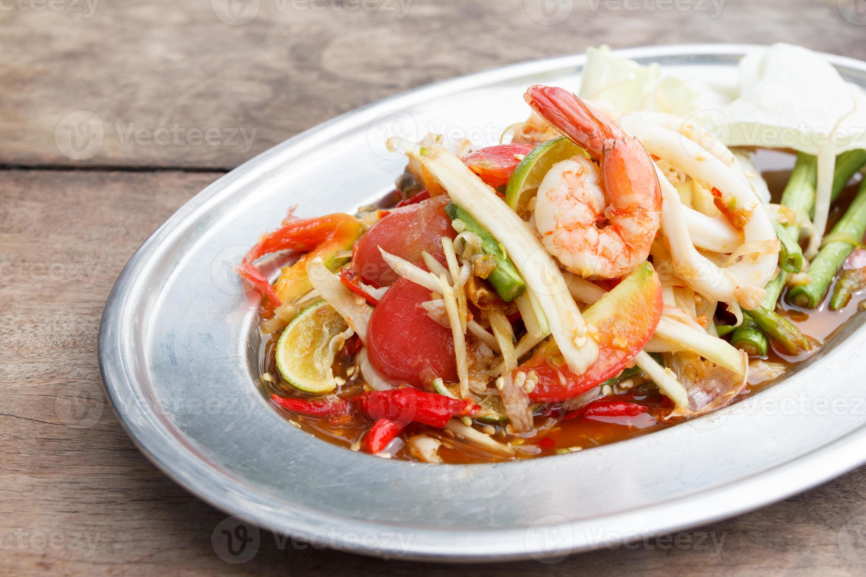 2 tsp thai fish sauce. Thai green papaya salad ส้มตำไทย (som tum). Add the shrimp and long beans and pound a few times to bruise the beans. Spicy seafood salad isolated on white, papaya salad with fresh shrimp and blue crab, thai food.